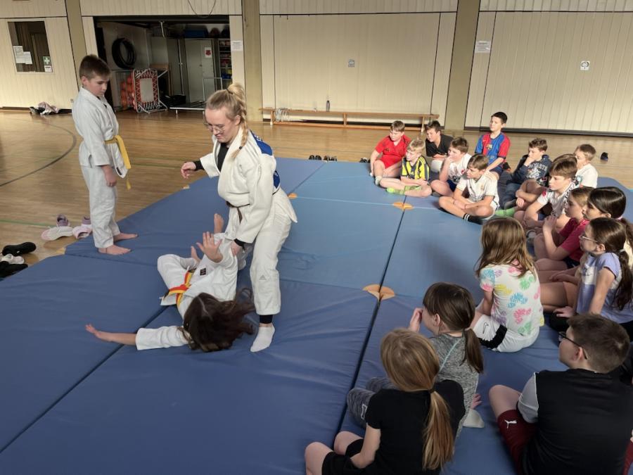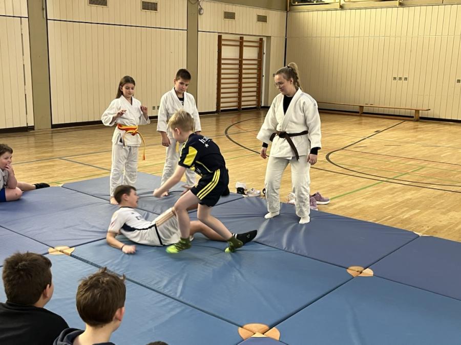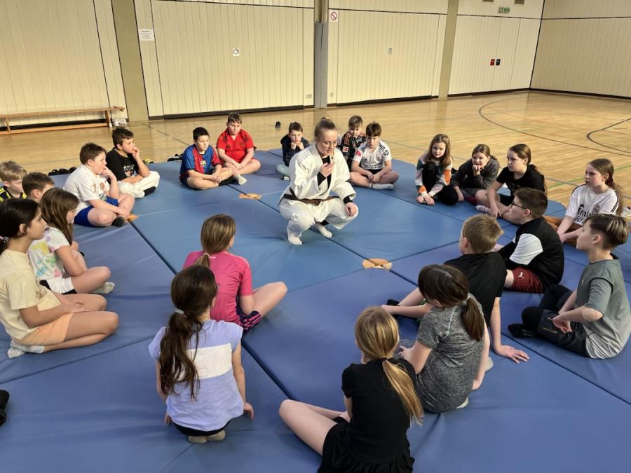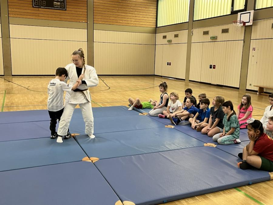 Frau Bräse demonstrierte mit den bereits erfahrenen Judoka Ida und Jakob, Schulkinder unserer Schule, das Prinzip des Judo sowie die ersten Judo-Techniken. Anschließend durften die Klassen selbst Judo ausprobieren. Die Kinder lernten, wie man richtig fällt, um sich nicht zu verletzen, und übten bereits ihren ersten Wurf und Haltegriff. Einige Klassen hatten sogar die Gelegenheit, sich in kleinen Übungskämpfen zu erproben, was für viel Begeisterung sorgte. Während des gesamten Tages wurde betont, dass die Werte des Judo von besonderer Bedeutung sind. Die Kinder erfuhren, dass Judo nicht nur ein Sport, sondern auch eine Lebensschule ist.