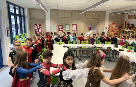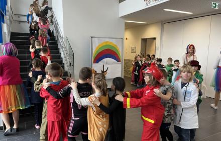 Ausgelassen und fröhlich ging es an Schwerdonnerstag in unserer Schule zu. Viele kleine Zauberer und Zauberinnen, Piraten und Piratinnen, Indianer und Cowboys, Einhörner, Rehe und anderes Getier feierten gemeinsam und verwandelten das schöne Schulgebäude in eine einzigartige "Party-Meile".