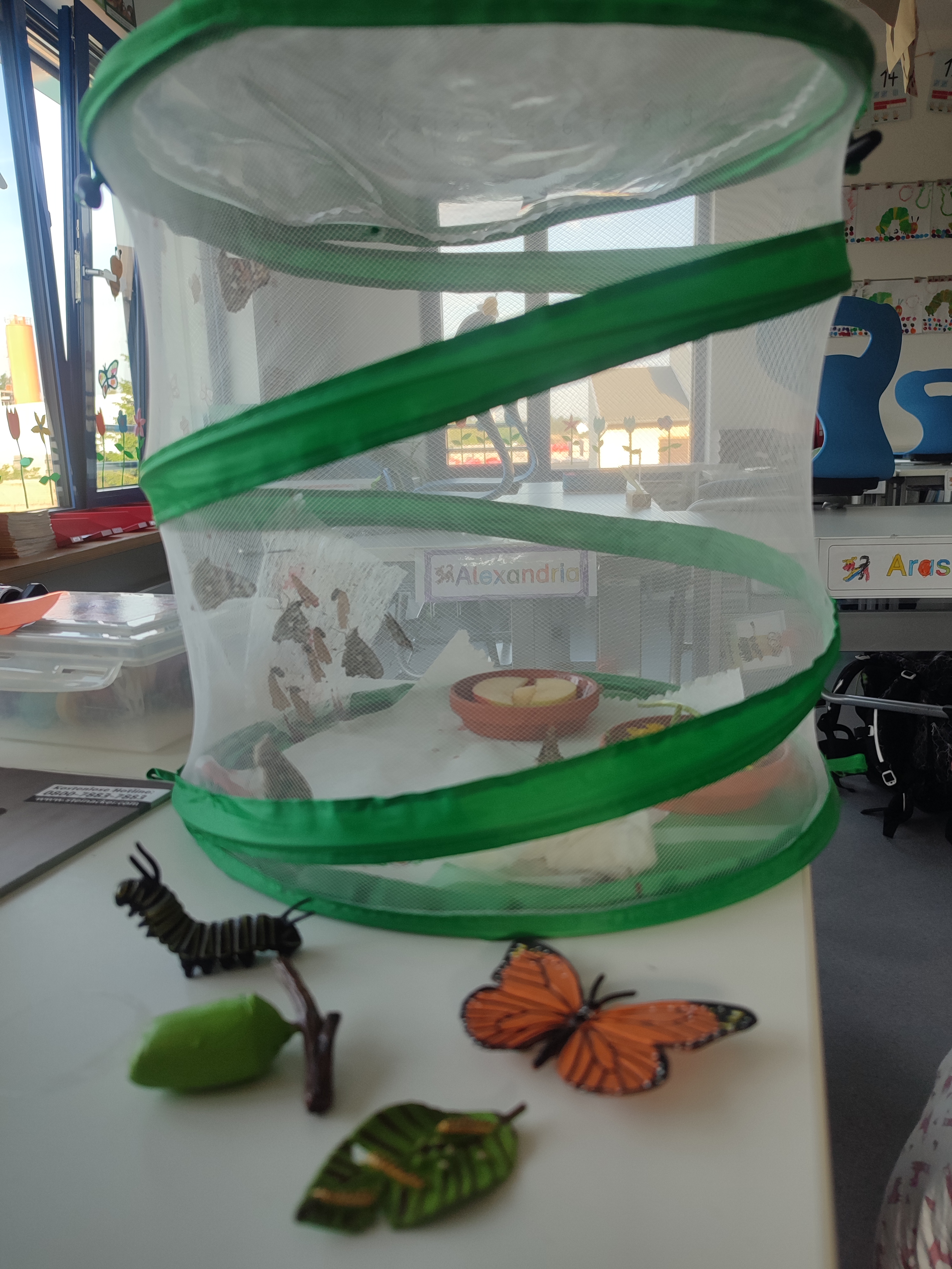 Am Donnerstag, den 01.05.24, schlüpften die sieben verpuppten Raupen still und heimlich aus ihrem Kokon und überraschten die Kinder sowie die Klassenlehrerin, als diese nach dem Feiertag das Klassenzimmer betraten.